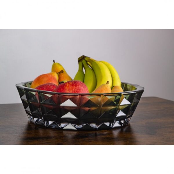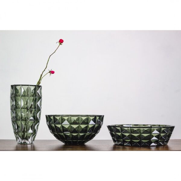 Efektowna misa Diamond Smokey Green to eleganckie połączenie nowoczesnej formy i klasycznego stylu. Wykonana z wysokiej jakości szkła kryształowego, zachwyca charakterystycznym diamentowym szlifem, który pięknie załamuje światło i podkreśla głęboki, dymno-zielony kolor szkła.