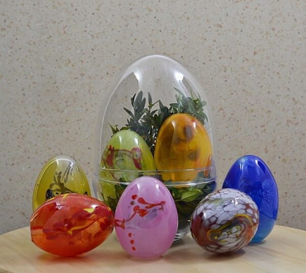 • Przezroczyste szklane naczynie w kształcie jajka.