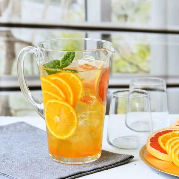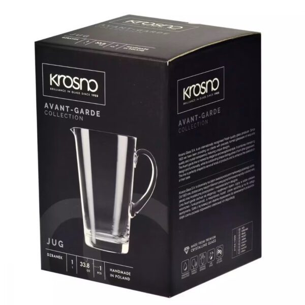 Elegancki szklany dzbanek o pojemności 1 litra, do serwowania wody, soku i innych zimnych napojów, będzie niezastąpionym uzupełnieniem każdego, domowego przyjęcia. Praktyczny rozchylany kształt przypadnie do gustu zarówno młodszym, jak i starszym znawcom stylu. Produkt został wykonany tradycyjną metodą ręczną, co spodoba się miłośnikom kunsztu i osobom wrażliwym na jakość.