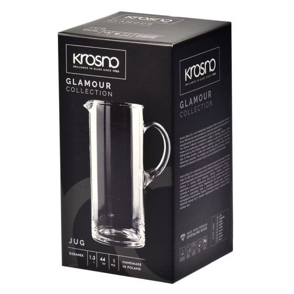 Duży dzbanek z kolekcji Glamour, wykonany z wysokiej jakości szkła, sprawdził się do wody, soków oraz innych zimnych napojów. To nie tylko funkcjonalne naczynie, ale także stylowa dekoracja stołu, idealna do uzupełnienia zastawy. Dzięki uniwersalnemu designowi – klasycznemu kształtowi, prostym ściankom – dzbanek świetnie wpisuje się w uniwersalne, jak i bardziej tradycyjne wnętrza.