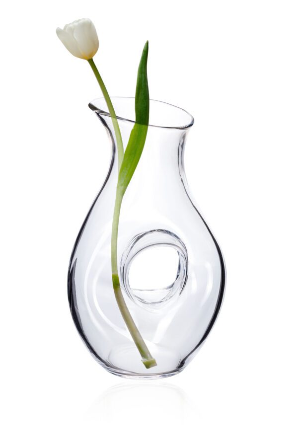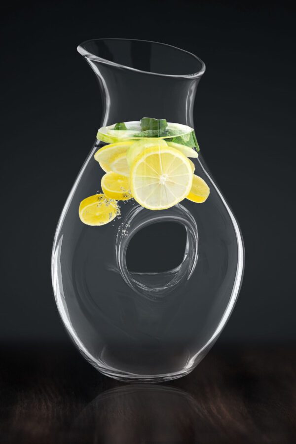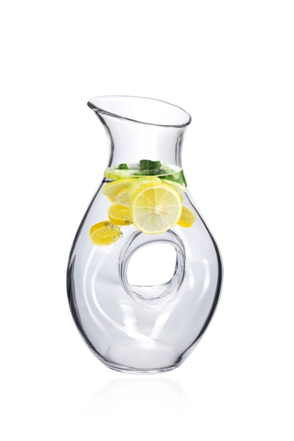 ✅ Szklany dzbanek o nowoczesnym kształcie w którym szczególną uwagę zwraca nowoczesna forma, w której klasyczny uchwyt został zastąpiony przechodzącym na wylot otworem.