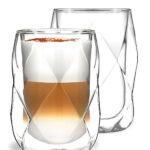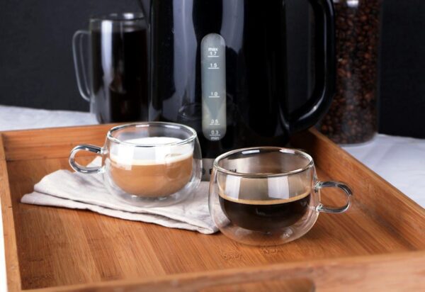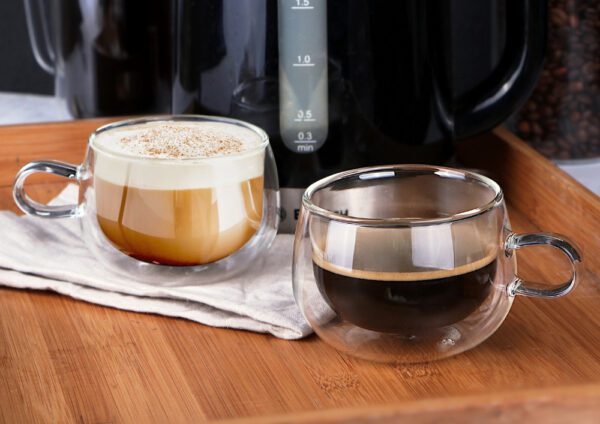 Szklanki filiżanki termiczne z podwójną ścianką wykonane z lekkiego szkła boro-krzemowego, zaletą tego szkła jest odporność na wysokie i niskie temperatury od -20 do +150 stopni Celsjusza.