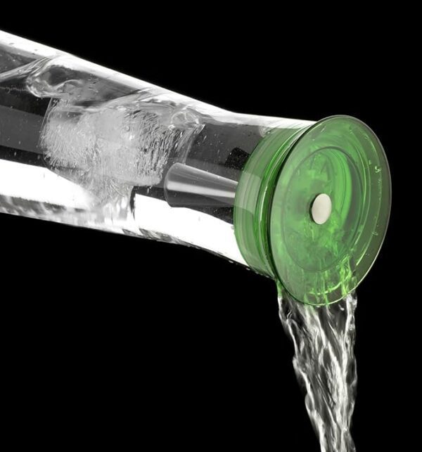 Szklana karafka Indis na wodę z zielonym plastikowym korkiem wyróżnia się innowacyjną konstrukcją, nowoczesnym wyglądem oraz praktycznym rozwiązaniem — nie ma potrzeby wyciągania korka, aby nalać wodę do szklanki. Wystarczy przechylić karafkę, a wbudowane sito, będące częścią korka, zatrzyma kawałki cytryny czy mięty, co ułatwia nalewanie napoju.