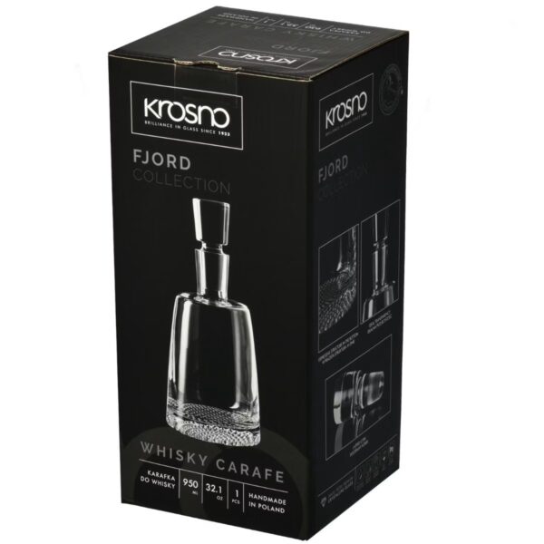Ekskluzywna karafka do whisky z linii Fjord o pojemności 950 ml z charakterystycznymi wgłębieniami przywodzącymi na myśl kryształki lodu w grubym dnie i solidnym, docieranym, szklanym korkiem zachwyca stylem. To nie tylko praktyczne, ale i eleganckie uzupełnienie stołu, otwartego barku, czy witryny, stworzone z myślą o prawdziwych miłośnikach wytwornego trunku. Stylową formę i wyrazistą, chropowatą strukturę w dnie wykonano tradycyjną metodą ręczną, co sprawia, że karafka jest niepowtarzalna, a jej detale docenią osoby wrażliwe na kunszt.