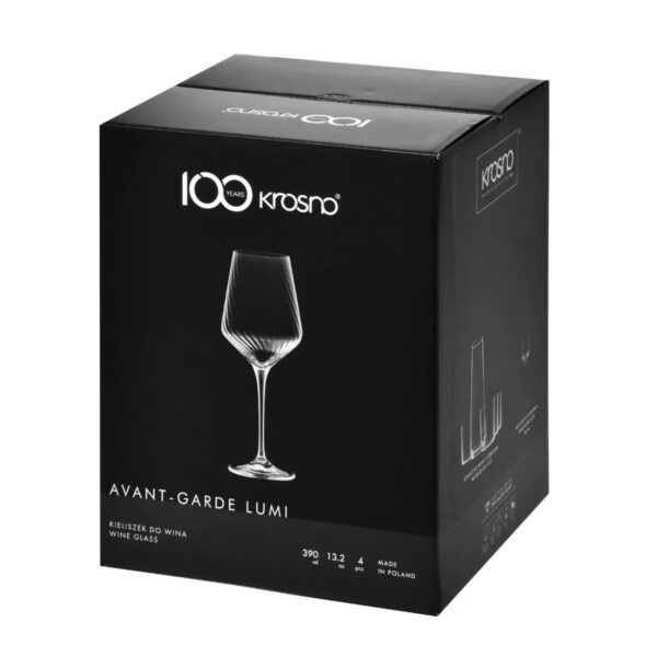 Bestsellerowe kieliszki do wina Avant-Garde są teraz dostępne w nowej wersji LUMI, z dyskretnym zdobieniem na szkle. Czarki kieliszków LUMI ozdobiono delikatnie skręconym wzorem optycznym, który pięknie załamuje światło. Wysoka nóżka kieliszka zakończona jest lekko geometryczną czarką. Kieliszki zostały zapakowane w eleganckie zestawy po 4 sztuki, każdy z nich ozdobiony jubileuszowym logo „100 lat KROSNO”. Kieliszki do wina Avant-Garde LUMI wykonano z wyjątkowo przejrzystego szkła Crystalline, odporne na matowienie i uszkodzenia mechaniczne.