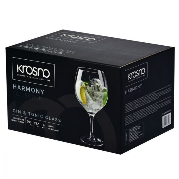 Kieliszki KROSNO Gin & Tonic z kolekcji HARMONY, o pojemności 700 ml, zostały zaprojektowane specjalnie z myślą o przygotowaniu Gin & Tonic. Ich rozmiary pozwalają na łatwe mieszanie składników i chłodzenie napoju kostkami lodu przed podaniem. Długa, smukła nóżka kieliszka chroni napój przed przegrzaniem od ciepła dłoni. Wykonane z przezroczystego, bezołowiowego szkła Crystalline, pozwalają cieszyć się pięknem klarownego toniku.