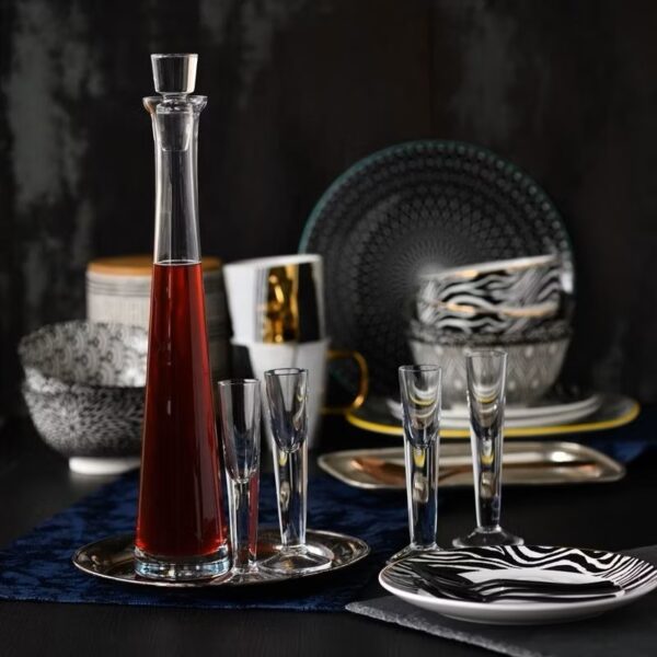 Klasyka nowoczesnego szkła, która urzeknie każdą osobę czułą na stylowe formy. Wysoka, smukła karafka z docieranym, szklanym korkiem i kieliszki, których czarka płynnie przechodzi w nóżkę zwężając się ostro ku dołowi to idealny prezent dla wielbiciela kunsztownego wykonania i wysokich walorów estetycznych. Najwyższa jakość ręcznej produkcji sprawia, że komplet jest niepowtarzalny.