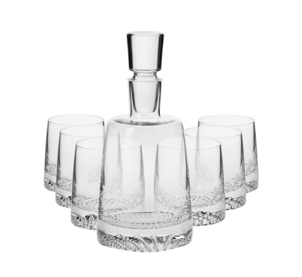 Ekskluzywny komplet do whisky, w skład którego wchodzi karafka o pojemności 950 ml oraz sześć szklanek 300 ml, to nie tylko praktyczny i elegancki, obowiązkowy zestaw w domu każdego konesera whisky, ale także doskonały prezent na specjalne okazje. Nowoczesny kształt spodoba się wielbicielom stylistyki skandynawskiej. Komplet pozwoli najlepiej wydobyć i podkreślić smak i aromat whisky. Zdobienia, przywodzące na myśl kryształki lodu czynią z zestawu niepowtarzalną, stylową ozdobę, która doskonale będzie prezentować się na stole, w witrynie jak i w otwartym barku.