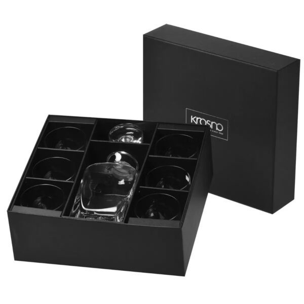 Kwadratowa karafka do whisky o pojemności 750 ml, z charakterystycznym pęcherzykiem powietrza zatopionym w grubym dnie, z solidnym, szklanym korkiem oraz stylowe szklanki 250 ml o gładkim rancie. Komplet z linii Legend spodoba się smakoszom whisky dbającym o detale estetyczne i klasyczną sztukę serwowania trunku. Przejrzyste szkło Crystalline z idealnym połyskiem, z którego został wykonany zestaw sprawiają, że można zachwycać się barwą trunku. Perfekcyjne, ręczne wykonanie spodoba się osobom ceniącym wysoką jakość i ciekawy design. Wszystkie te cechy sprawiają, że karafka ze szklankami do whisky jest doskonałym prezentem dla amatorów mocniejszych trunków.