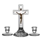 - Krzyż na podstawie – centralny element zestawu, symbolizujący wiarę i odkupienie.