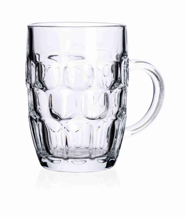 Kufel do piwa, wykonany z grubego i wytrzymałego szkła.