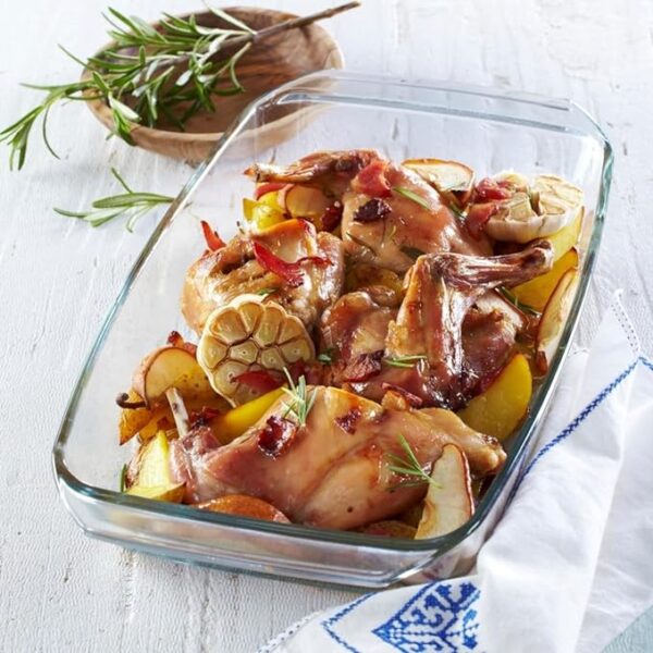 Prostokątne naczynie żaroodporne z pokrywą to doskonała forma do pieczenia i zapiekania w różnych typach piekarników.