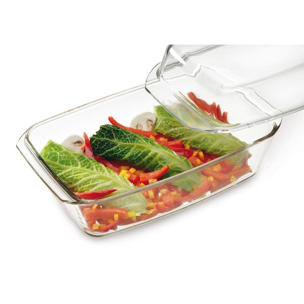 Prostokątne szklane naczynie z pokrywą, wykonane z wysokogatunkowego szkła żaroodpornego, wytrzymuje temperatury od -40°C do 300°C i jest bezpieczne w kontakcie z żywnością. Szkło marki SIMAX charakteryzuje się odpornością na substancje chemiczne, jest gładkie, nieporowate, krystalicznie przezroczyste i odporne na korozję. Naczynie o pojemności 5,4 L jest wszechstronne w użyciu – nadaje się do pieczenia, duszenia i zapiekania. Jest idealne do tworzenia zdrowych posiłków dla całej rodziny.