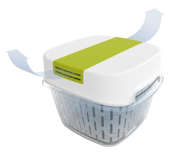 ✅ Otwory wentylacyjne w pokrywie umożliwiają cyrkulację, a także zawierają miejsce na filtr absorbujący gazy etylenowe.