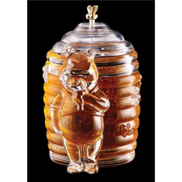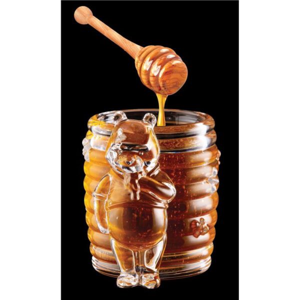 Kryształowy pojemnik na miód z złotą pszczółką i niedźwiadkiem, w zestawie z drewnianym nabierakiem do miodu.
