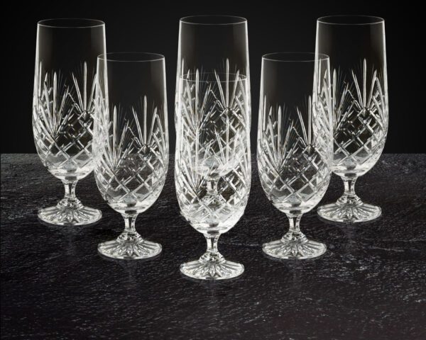 Zestaw sześciu pokali do piwa lub cydru, wykonanych z wysokiej jakości szkła kryształowego, ozdobionych tradycyjnym motywem 'ANANAS’.