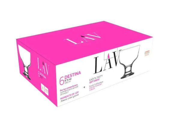 Komplet sześciu pucharków deserowych z kolekcji Destina od Lav. Pucharki mają pojemność 285 ml, są stabilne i umieszczone na eleganckiej nóżce. Wykonane z hartowanego szkła o wysokiej przejrzystości, idealnie prezentują serwowane w nich desery, lody lub sałatki. Są to pucharki uniwersalne, doskonale nadające się do użytku domowego, jak również w kawiarniach i restauracjach. Nadają się do mycia w zmywarce. Destina to doskonały pomysł na upominek.