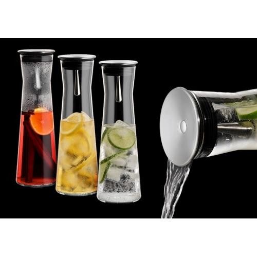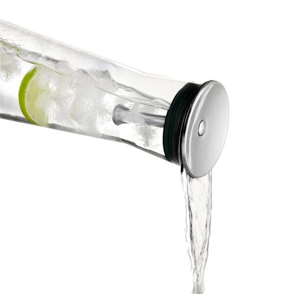 Szklana karafka Indis na wodę z metalowym korkiem wyróżnia się innowacyjną konstrukcją, nowoczesnym wyglądem oraz praktycznym rozwiązaniem — nie ma potrzeby wyciągania korka, aby nalać wodę do szklanki. Wystarczy przechylić karafkę, a wbudowane sito, będące częścią korka, zatrzyma kawałki cytryny czy mięty, co ułatwia nalewanie napoju.