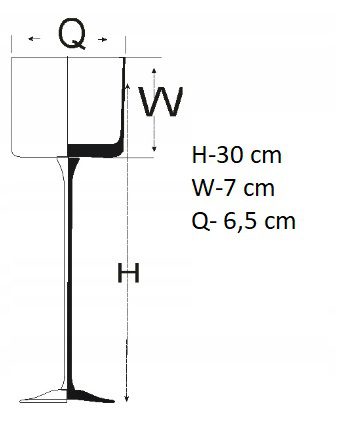 - Wymiary: Wysokość 30 cm, średnica kielicha 6,5 cm – imponujący, smukły kształt doskonale eksponuje świece i przyciąga uwagę.