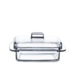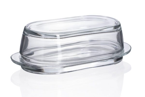Szklana maselnica NINA to naczynie o oryginalnym kroju z pokrywą szczelnie zabezpieczające kostkę masła.