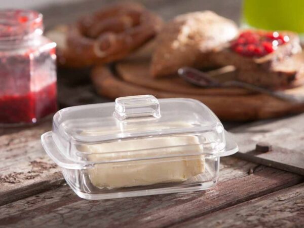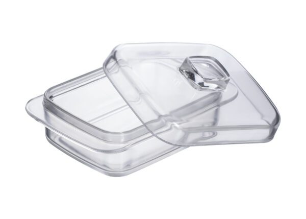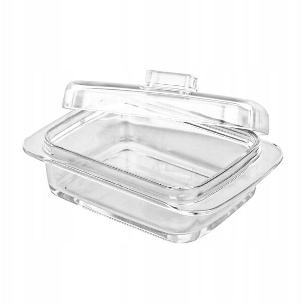 - Solidna szklana maselniczka wykonana z grubego przezroczystego szkła.