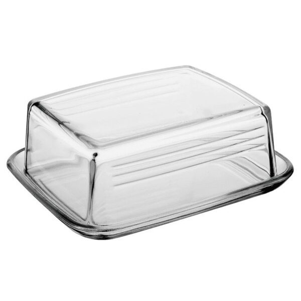 - Solidna szklana maselniczka wykonana z grubego przezroczystego szkła.