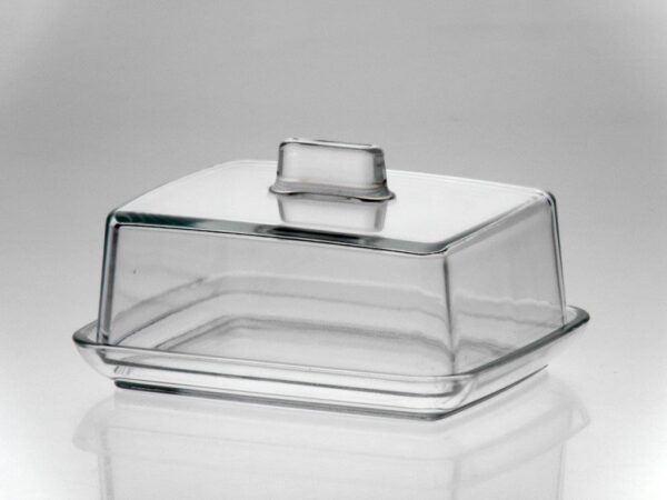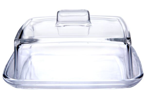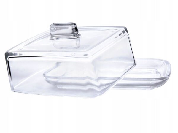 - Solidna szklana maselniczka wykonana z grubego przezroczystego szkła.