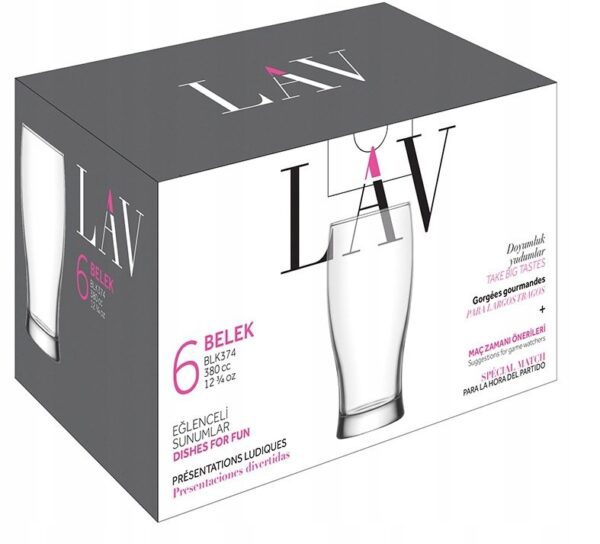 Zestaw sześciu szklanek do piwa o pojemności 380 ml z serii Belek marki LAV to produkty wysokiej jakości. Wykonane z trwałego szkła, są one solidne i mają estetyczny wygląd. Idealnie nadają się zarówno na specjalne okazje, jak i do codziennego użytku.