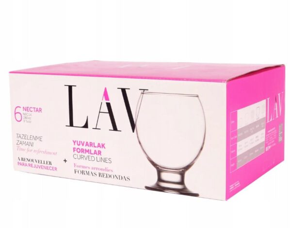 Komplet szklanek na stopce z serii Nectar marki Lav. Pucharki do lodów są wykonane z grubego, hartowanego szkła. Mają pojemność 280 ml i wysokość 10,5 cm. Nadają się do mycia w zmywarce. Pucharki deserowe są idealne zarówno do użytku w kawiarniach, jak i w domu.