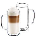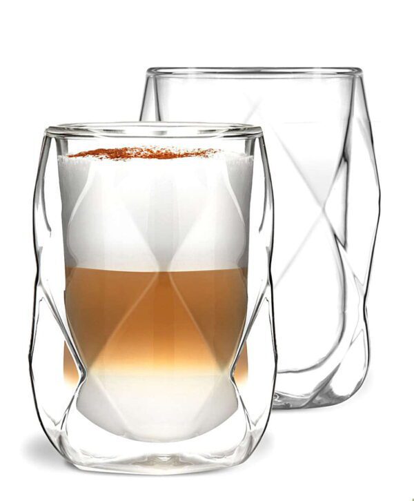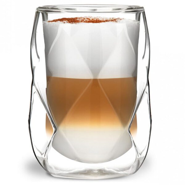 Szklanki termiczne z podwójną ścianką wykonane z lekkiego szkła boro-krzemowego, zaletą tego szkła jest odporność na wysokie i niskie temperatury od -20 do +150 stopni Celsjusza.