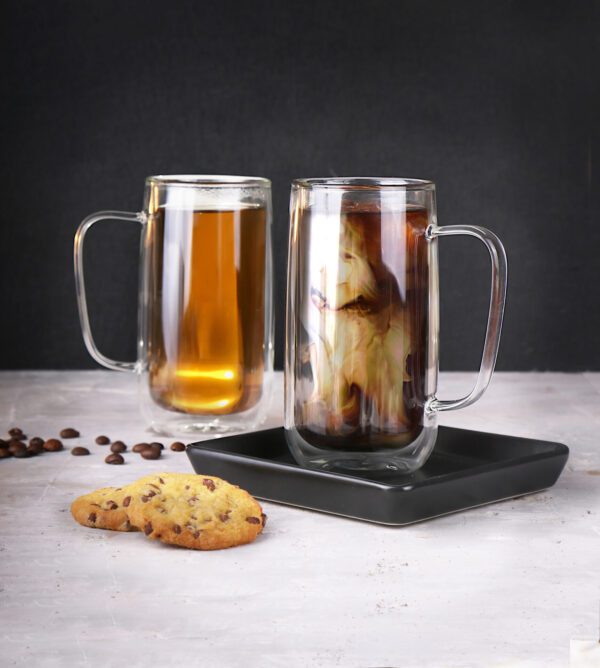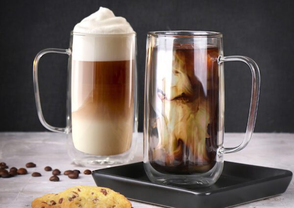 Szklanki termiczne z podwójną ścianką wykonane z lekkiego szkła boro-krzemowego, zaletą tego szkła jest odporność na wysokie i niskie temperatury od -20 do +150 stopni Celsjusza.