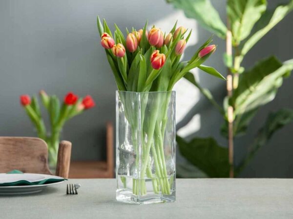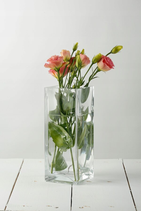 - Nowoczesny, szklany wazon kwadratowy o wysokości 15 cm dobrze się prezentują z kwiatami lub ze świecami.