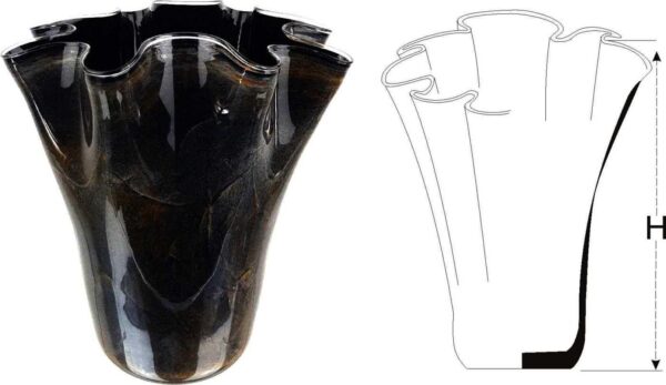 Szklany wazon dekoracyjny, który rozszerza się ku górze, wyróżnia się ozdobną falbanką na brzegu. Jego wielobarwne zabarwienie dodaje uroku. Produkt ten, będący wyrazem wysokiej jakości, doskonale prezentuje się zarówno z kwiatami ciętymi, jak i sztucznymi. Jest idealnym elementem dekoracyjnym dla różnorodnych wnętrz i powinien znaleźć się w każdym domu.
