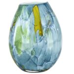Szklany wazon dekoracyjny, który rozszerza się ku górze, wyróżnia się ozdobną falbanką na brzegu. Jego wielobarwne zabarwienie dodaje uroku. Produkt ten, będący wyrazem wysokiej jakości, doskonale prezentuje się zarówno z kwiatami ciętymi, jak i sztucznymi. Jest idealnym elementem dekoracyjnym dla różnorodnych wnętrz i powinien znaleźć się w każdym domu.