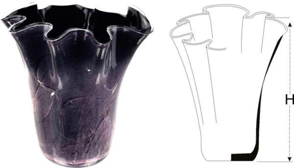 Szklany wazon dekoracyjny, który rozszerza się ku górze, wyróżnia się ozdobną falbanką na brzegu. Jego wielobarwne zabarwienie dodaje uroku. Produkt ten, będący wyrazem wysokiej jakości, doskonale prezentuje się zarówno z kwiatami ciętymi, jak i sztucznymi. Jest idealnym elementem dekoracyjnym dla różnorodnych wnętrz i powinien znaleźć się w każdym domu.