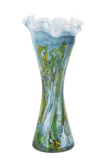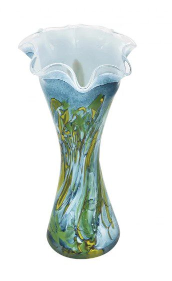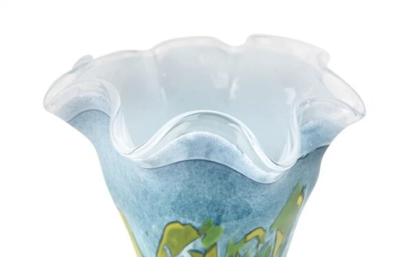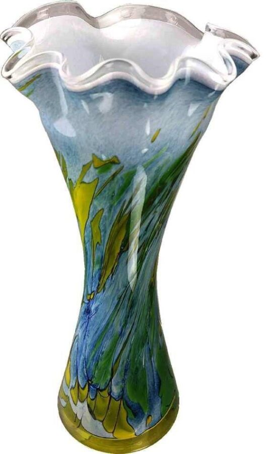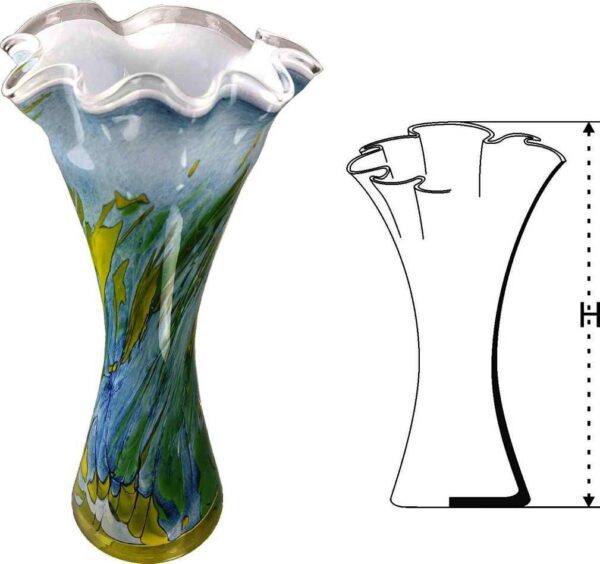 Szklany wazon dekoracyjny, który delikatnie rozszerza się ku górze, wyróżnia się ozdobną falbanką na brzegu. Jego wielobarwne zabarwienie dodaje uroku. Produkt ten, będący wyrazem wysokiej jakości, doskonale prezentuje się zarówno z kwiatami ciętymi, jak i sztucznymi. Jest idealnym elementem dekoracyjnym dla różnorodnych wnętrz i powinien znaleźć się w każdym domu.