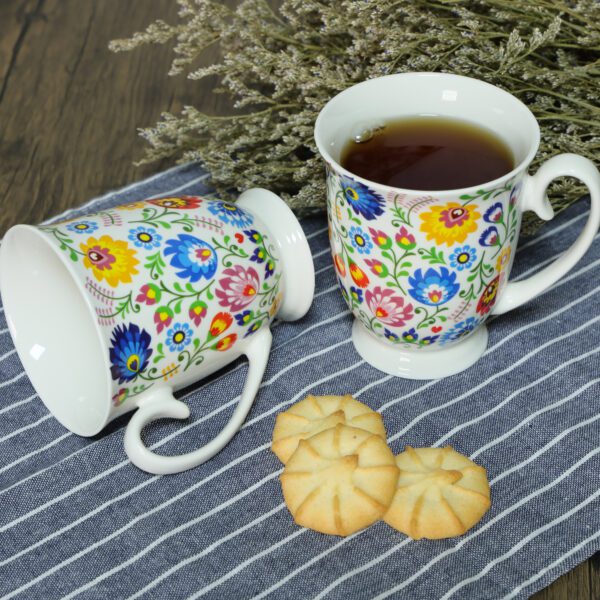 Dzięki żywej kolorystyce kubki doskonale pasują zarówno do nowoczesnych, jak i tradycyjnych wnętrz. To idealny wybór do codziennego picia kawy, herbaty czy gorącej czekolady, a także piękny prezent dla miłośników folkloru i rękodzieła.